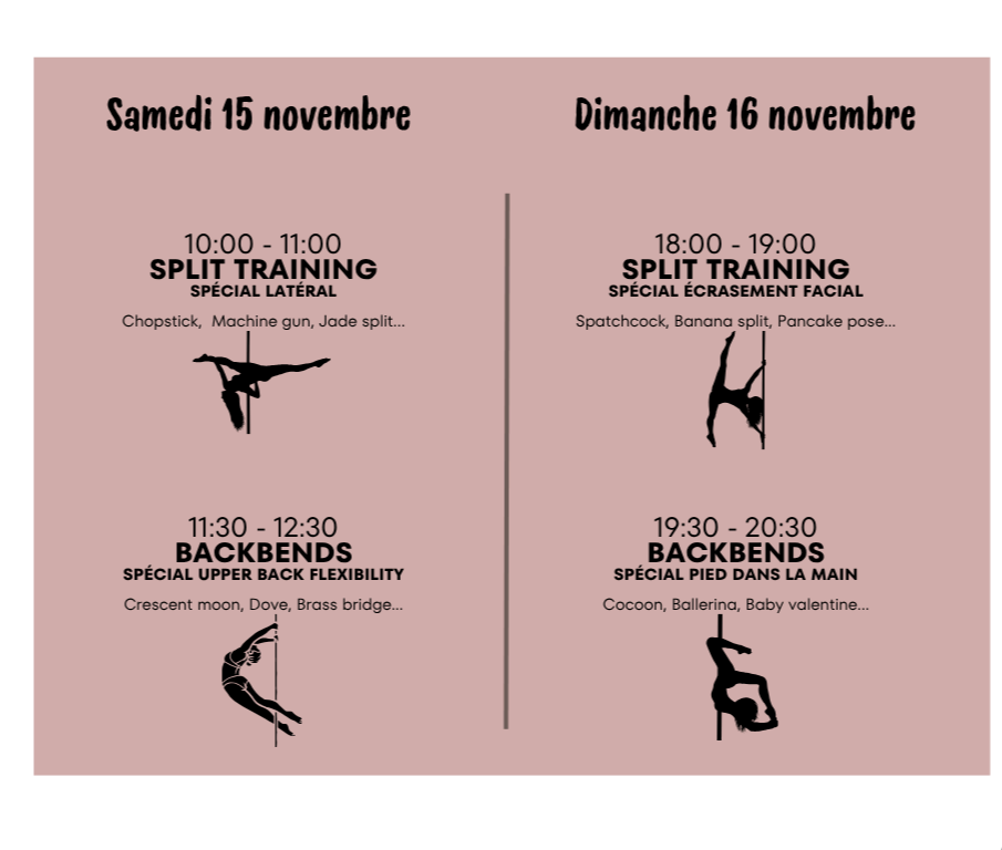 Ce Workshop se concentre sur l'amélioration de ta flexibilité + la compréhension de la mécanique d’un mouvement pour faciliter l'exécution des tricks sur la barre ou le cerceau.
